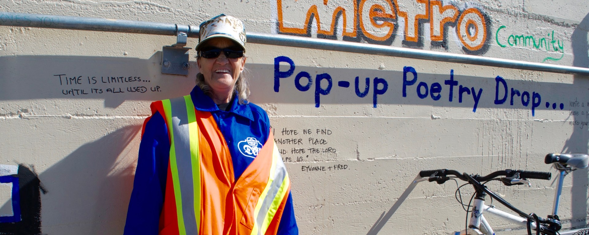 Story/poem contributed by Eyvonne, Photograph of Eyvonne at the Metro Community Poetry Wall by Lesley-Anne Evans